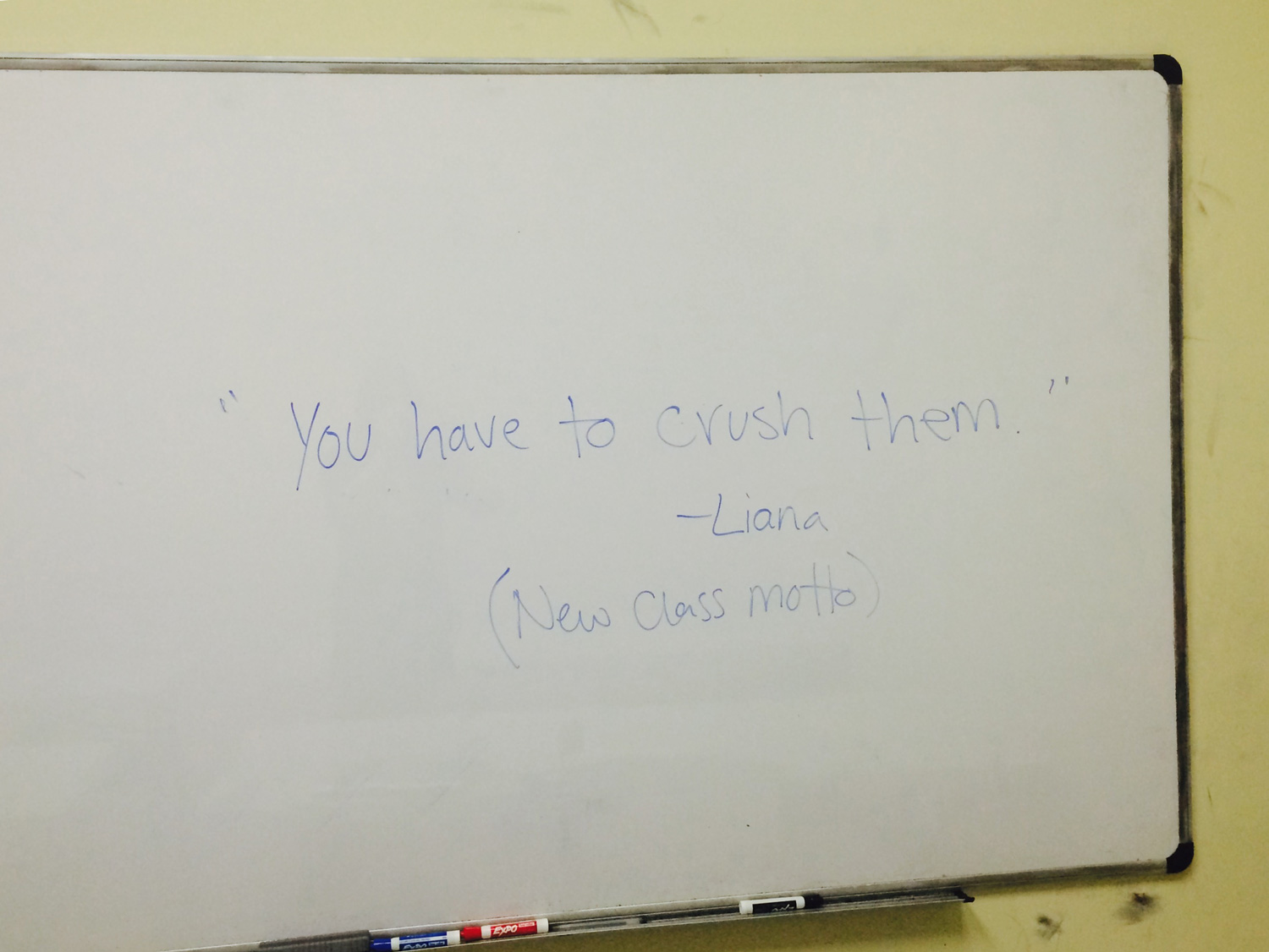 At this, the other female students begin to laugh; she smiles in acknowledgment, while the lone male in the room announces his intimidation and fear of her, although I suspect he actually thinks she’s cool. I end up writing the phrase on the whiteboard, our new class motto: "You have to crush them."