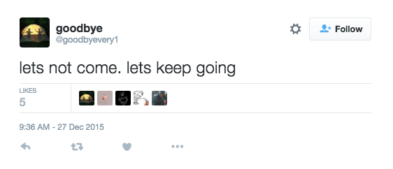 Recently, Ada O’Higgins and Burke Battelle’s @goodbyevery1, a project which calls itself “a conversational process which begins as a facebook group and never ends” tweeted; “lets not come, lets keep going,” a multi-entendre’d proposition in which there’s a lot at work.